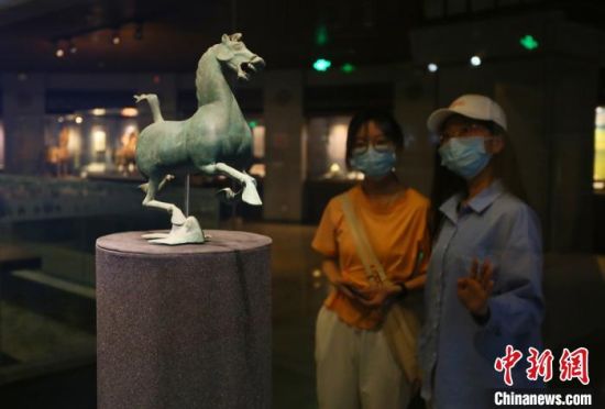 2020年5月18日,游客參觀銅奔馬。當天是國際博物館日,游客來到位于甘肅蘭州的甘肅省博物館有序參觀,感受絲路文明。(資料圖) 高展 攝
