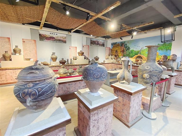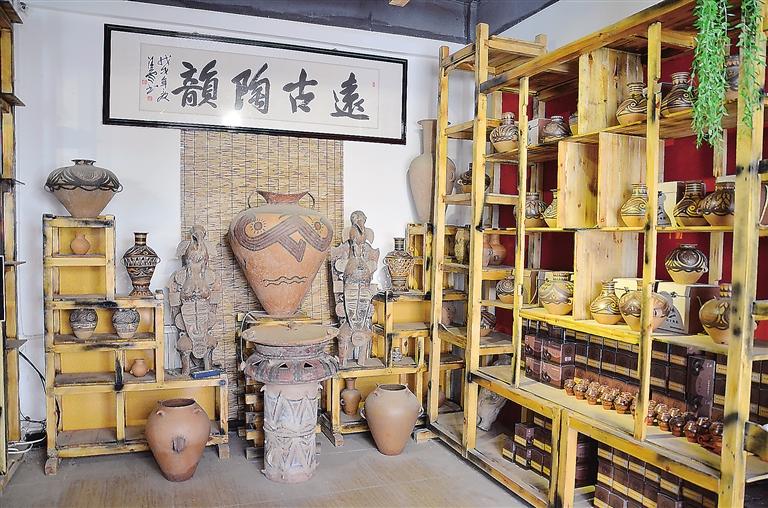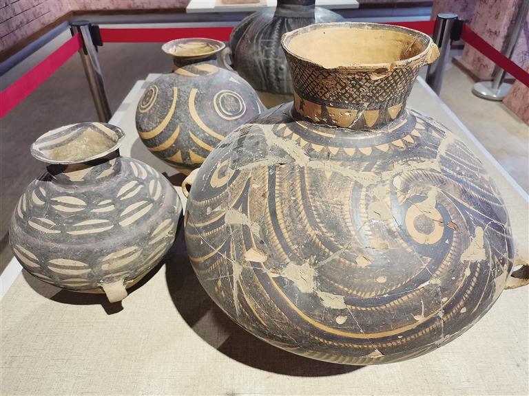 走進彩陶藝術館,目之所及都是造型獨特的仿彩陶罐,在墻上可以看到陶片裝飾的藝術品,細節透著“彩陶之鄉”的文化底蘊。