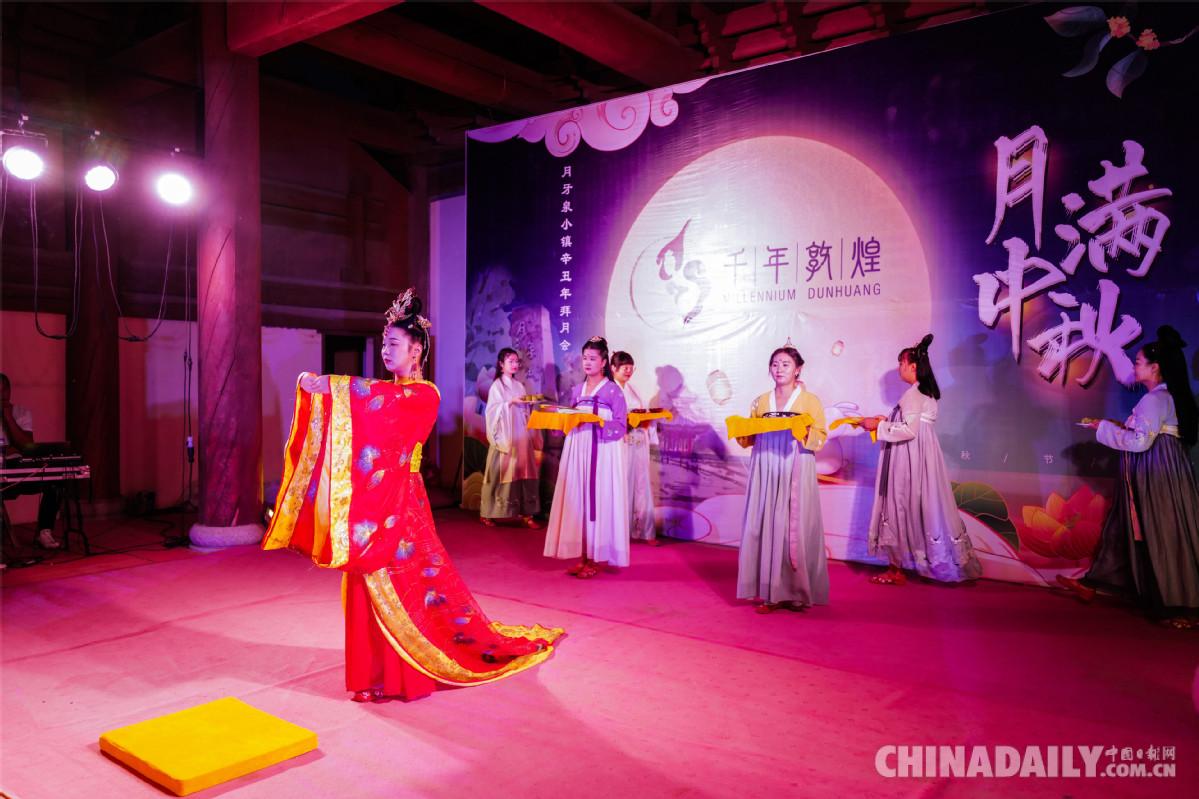 9月21日夜晚,一輪明月升起在大漠敦煌的上空,在中國傳統的中秋節,甘肅敦煌月牙泉小鎮中心廣場舉辦了中秋拜月等民俗活動。先舉行了仿古“拜月大典”。伴隨著深沉悠揚的樂曲,身穿華麗漢服的參祭女子手捧月餅及各式貢品緩步登臺,在皓月銀輝中虔誠致祭;按照敦煌習俗,主祭三上香、三祭酒,并于月光與燭光映照之中,向月誦祝。按照傳統儀式祭拜禮成后,主祭將月餅與水果分發給現場拜月的市民游客,與大家共享中秋拜月祭品。隨后還進行了中國傳統民族服裝——旗袍展示、漢服秀、歌舞演出等形式多樣的民俗活動。當日晚,小鎮人來人往非常熱鬧,眾多敦煌市民和游客參加拜月活動,受疫情影響,部分活動在網上進行,不少媒體人,對敦煌賞月、拜月活動進行了網絡直播。