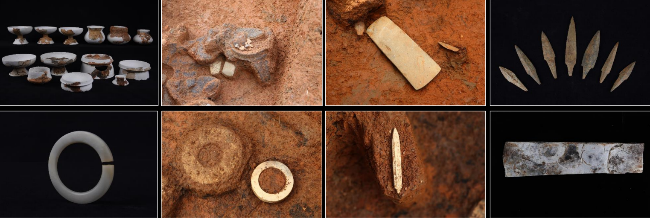 巖山寨遺址總面積約5萬平方米,包含居住區、墓葬區等多個功能區。居住區發現大量灰坑、柱洞,也夾雜少量墓葬,居住生活和喪葬并未完全分開。墓葬區共發掘墓葬66座,可見一次葬、二次葬和遷出葬現象,少數墓葬保存了木質葬具殘痕與人骨遺存,這在嶺南同類遺址中極為罕見。隨葬陶器組合以鼎、盤、豆、壺、罐為主,磨制石器以鏃、錛為主,玉器有琮、鉞、環、玦、璧、錛、錐形器及圭形器等,以玉鉞為最大宗。墓葬形制、喪葬禮俗及隨葬器物組合都具有顯著的石峽文化特征。墓葬表現出明顯的等級分化,高等級墓葬普遍隨葬玉器,其中M16隨葬品超過140件,包括5件玉鉞與2件玉環,M26則同時隨葬有玉琮與玉鉞。