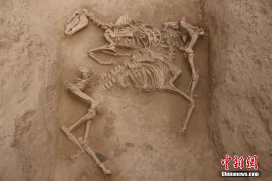 12月14日,甘肅省文物局發布該省武威地區唐代吐谷渾王族墓葬群最新考古研究成果。圖為長嶺M1墓道殉馬。 中新社發 甘肅省文物局 供圖