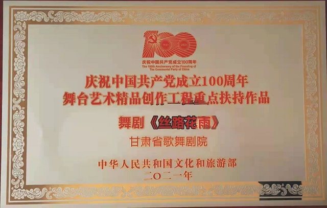 中國甘肅網12月19日訊 12月18日,文化和旅游部在山東省青島市召開的“2021年全國藝術創作工作會議”上,發布了“慶祝中國共產黨成立100周年舞臺藝術精品創作工程”入選名單,頒發了“慶祝中國共產黨成立100周年舞臺藝術精品創作工程獎牌”。甘肅省文化和旅游廳遴選推薦的舞劇《絲路花雨》《大夢敦煌》《彩虹之路》、隴劇《官鵝情歌》、小品《你笑起來真好看》等5部舞臺藝術精品,經文旅部評審正式入選“舞臺藝術精品創作工程重點扶持作品”。甘肅省歌舞劇院創排的舞劇《絲路花雨》作為12家“百年百部”工程受獎單位在全國藝術創作工作會議上接受獎牌和榮譽證書,甘肅省文旅廳、山東省文旅廳等參會代表12家領獎單位上臺領獎,充分展現了文旅部對甘肅省入選作品質量及組織工作的高度肯定。