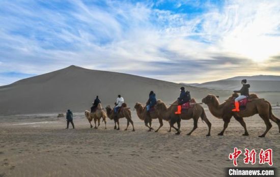 新年伊始,游客在敦煌鳴沙山騎駱駝欣賞大漠風(fēng)光。 王斌銀 攝