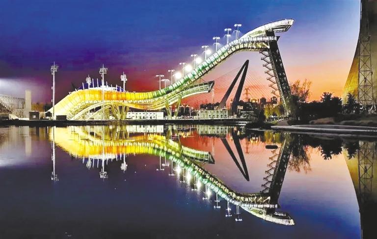宛若敦煌“飛天”飄帶的首鋼滑雪大跳臺由賽道、裁判塔和看臺區域三部分組成,賽道長164米,賽道最寬處34米,最高點60米,單板選手從高處疾速下滑,通過大跳臺起跳,進行高空空翻、回轉等技術動作!這是全球首座單板大跳臺運動永久跳臺,也是冬奧史上第一座與工業遺產再利用直接結合的競賽場館。