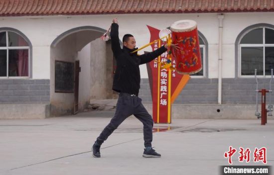 中新網蘭州2月18日電 (徐雪 魏宇嘉)2月中旬,在甘肅蘭州市永登縣苦水鎮,33歲鄧鑫擊打起太平鼓,紅色的鼓或被擎于頭頂,或被旋至身后,騰起跨越間,鼓鞭捶打出陣陣鼓聲,頓挫磅礴,具有穿透力。