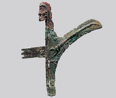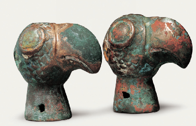 鷹是一些游牧民族崇拜的猛禽,十分威猛。青銅鷹首為軸桿類頂端的飾物,部族首領手執桿頭有鷹首的器物以象征權威和神圣。