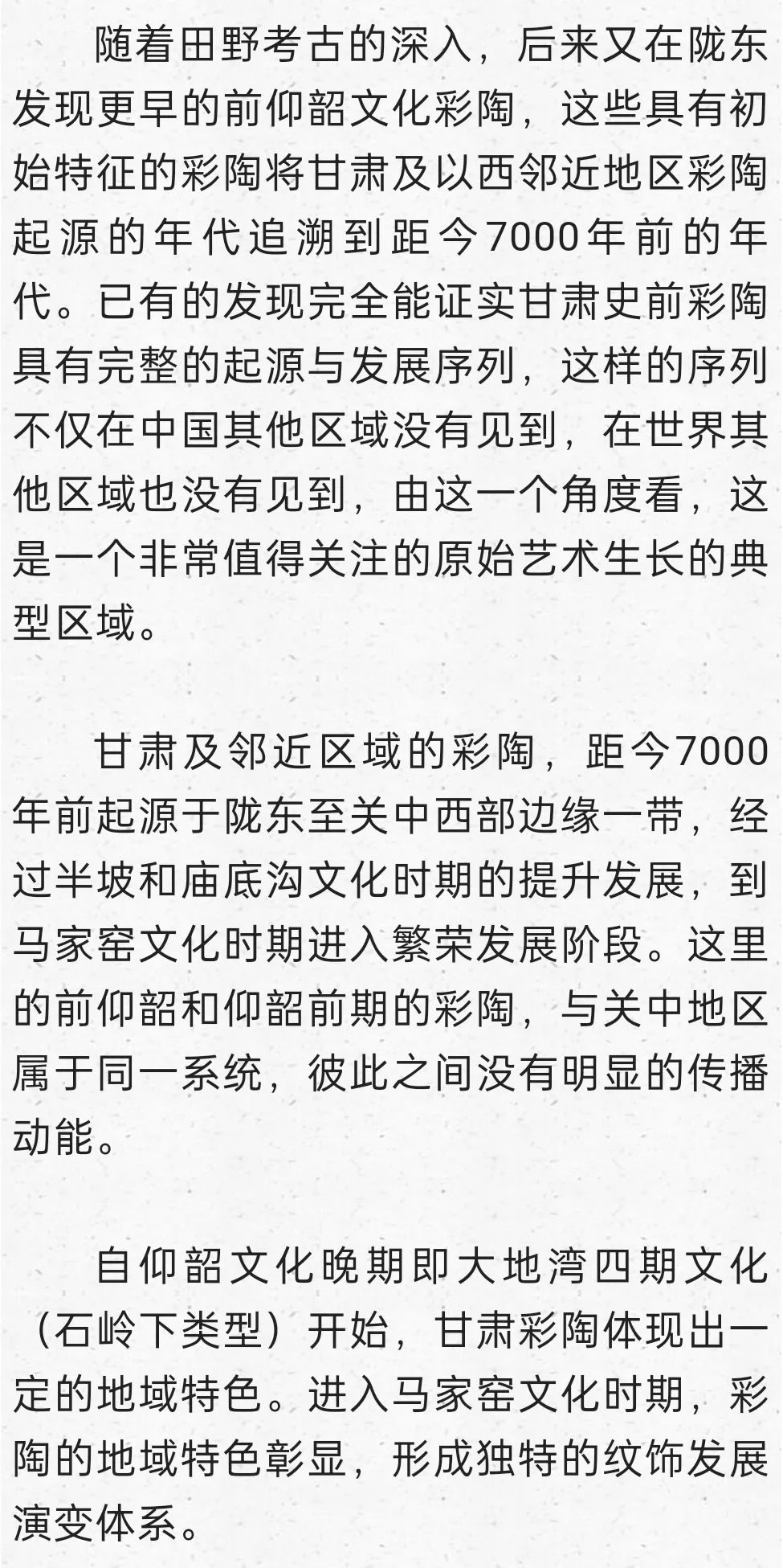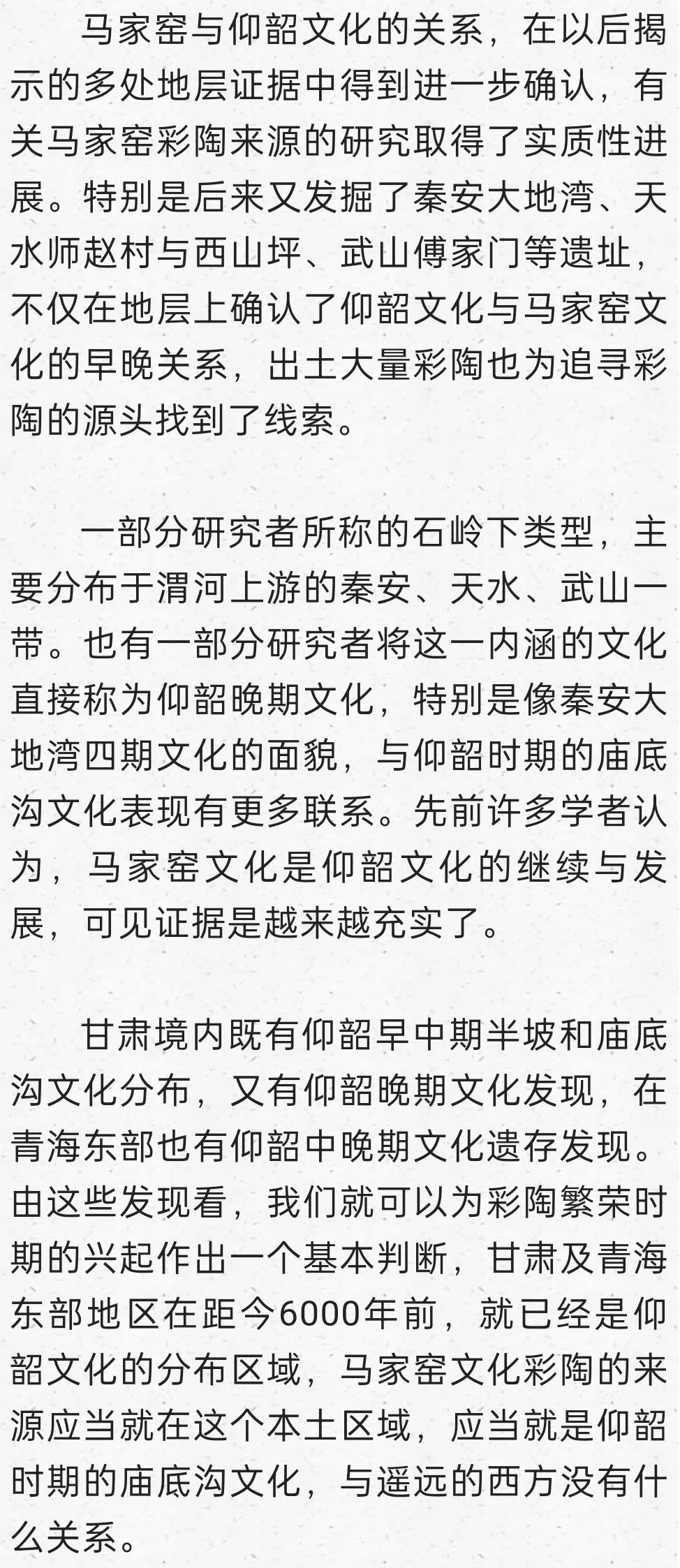 在這里明確提出到甘青尋找仰韶文化的正源,后來我又寫成《秦安大地灣遺址彩陶研究》,討論甘青彩陶的序列,也表達了類似觀點:“甘肅及青海東部地區在距今6000年前左右,就已經是仰韶文化的分布區域,馬家窯文化彩陶的來源應當就在這個本土區域,應當就是仰韶時期的廟底溝文化。從文化的分布與地層堆積關系找到了甘肅地區考古學文化明確的傳承關系,由彩陶紋飾演變的考察也能尋找到傳承的脈絡”。
