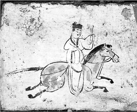 這一時期,自天子以至百官士庶,除乘車外還普遍騎馬。西晉時北方出現上馬時所踩的單馬鐙,南北朝后期又出現嚴格意義上的雙馬鐙。馬鐙的使用能減輕人們騎馬的體力消耗,有利于控制馬匹。這一時代的低級官員和百姓出行還乘驢、騾,甘肅等西北地區少數民族多乘駝,運載貨物主要用牛車。漢地民眾出行,仍然是安步當車。嘉峪關魏晉墓五號墓的《驛使圖》,畫面中一個郵驛使騎在馬上,頭戴進賢冠,身穿右襟寬袖衣,足蹬長靴,左手舉木牘文書,右手持馬韁,驛騎四蹄騰空,飛奔直前。這幅畫再現了當時甘肅地區驛使馳送文書的情景,也是我國古代郵驛使較早的形象資料。