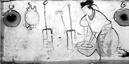 糧食、蔬菜品種與前代相比沒有大的變化,仍是漢地人的主要經濟和衣食來源。烹飪方法,這一時期出現了面粉發酵技術。北魏賈思勰介紹發面技術說:“面一石,白米七八升作粥,以白酒六七升酵中,著火上,酒魚眼沸,絞去滓,以和面,面起可作”(《齊民要術》卷9)。把北魏時期的容量數換算成今天的市斤,上段話的意思就是,用五十多斤面粉,五六斤白米做粥,再用四五斤白酒(甜米酒)做酵母,將酒架火上燒至發出魚眼樣的小泡后,濾去酒渣,加入面粥中發酵,等面發起后就可以做餅了。這是一項歷史性的烹飪技術。從發面的數量看,一次發這樣多面的家庭,至少有三五十口人,顯然是當時世家大族的人口規模。世族如此,普通民眾也應很快就學習掌握了發面技術。