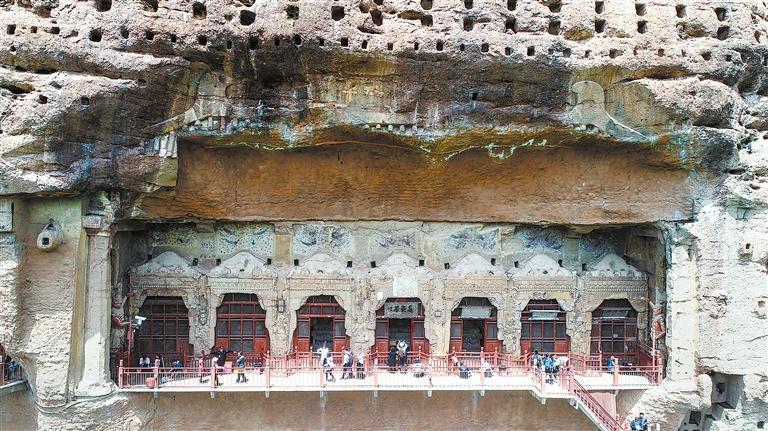 麥積山石窟第4窟,俗稱“散花樓”。位于東崖上部,又名“上七佛閣”,是麥積山石窟最為宏偉壯觀的一個洞窟。此窟開鑿于北周(公元557年-581年)時期,根據史籍記載為秦州大都督李允信為其亡父祈福所建造的“功德窟”。通高16米,橫寬31.7米,進深13米。其形制為七間八柱仿木構崖閣式宮殿建筑。因地震等自然因素的破壞,洞窟前半部分坍塌,前廊六根柱廊崩毀,僅存七龕及部分梁柱尚保存完好。