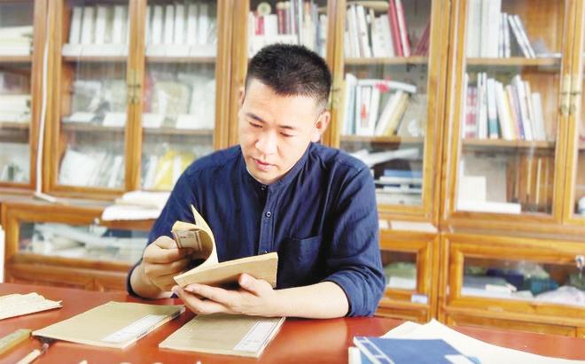 他一邊輕輕撥弄著桌案上泛黃的紙頁,一邊用毛筆蘸上漿糊,粘補書頁上的缺損部分。