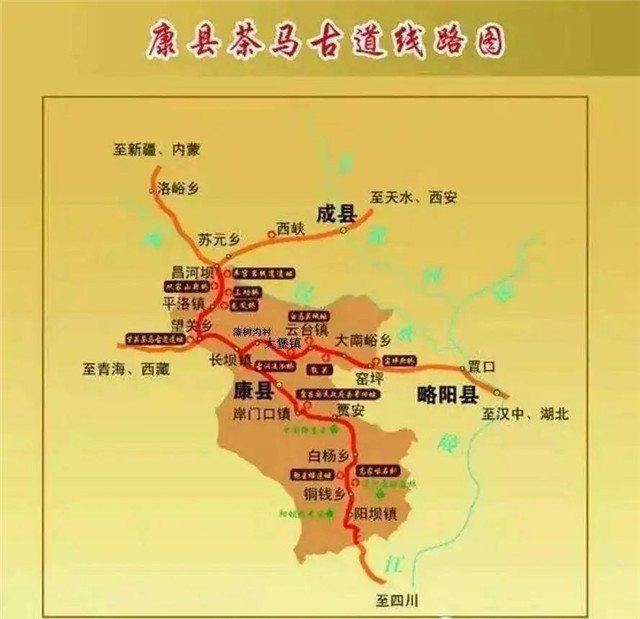 甘肅境內的茶馬古道大致走向如下:茶葉由四川進入文縣,沿白龍江到達武都,經宕昌到岷縣進而進入藏族地區;由陜西進入隴南,經成縣、西和到天水,經甘谷、武山到達臨洮,在此可以分出兩條路徑,向北可達蘭州等地,往西可進入臨夏,進而進入藏族地區。