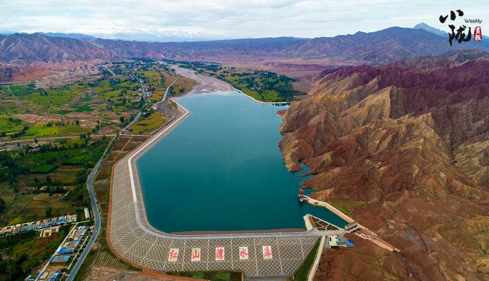 紅山灣水庫與丹霞國家地質公園山水相映,展現了“戈壁水鄉”的生態和諧新形象。