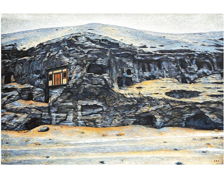 房建平多年來扎根甘肅、扎根西北,深受敦煌藝術(shù)的影響,并由此產(chǎn)生了自己獨到的見解。他以當下的視角去審視千年之前的敦煌壁畫,思考古代工匠創(chuàng)作的技法運用以及時代所賦予工匠們的精神面貌。他在深入研究敦煌壁畫的過程中,被那豐富的色彩所吸引,被那厚重斑駁的肌理所嘆服,被那點線面的旋律所震撼。他孜孜不倦、廢寢忘食地學習,吸收借鑒敦煌壁畫的元素,然而并非簡單地臨摹、復制與再現(xiàn),而是于審視、思索之后源源不斷地發(fā)現(xiàn)、感受、弘揚。更為可貴的是,他竭力探尋敦煌莫高窟的精神內(nèi)涵,包括開放包容多元文化一體的精神、莫高窟守護人的工匠精神的共同凝聚。