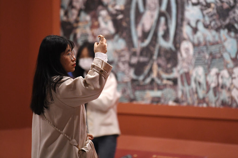 當(dāng)日是清明節(jié)假期,眾多市民和游客來(lái)到位于蘭州黃河岸邊的敦煌研究院蘭州分院敦煌藝術(shù)館參觀“打卡”,欣賞“覺(jué)色敦煌 莫高精神”敦煌石窟藝術(shù)展,近距離感受敦煌文化藝術(shù)的魅力。