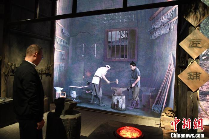 圖為游客在大漢賦館內參觀鐵匠鋪。 戴文昌 攝
