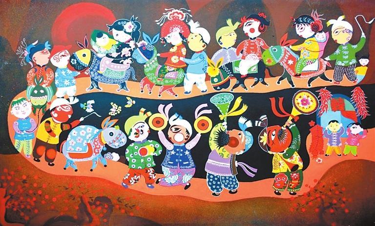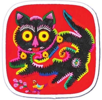 華池民間布貼畫是一種古老的民間工藝美術(shù),是隴東文化的重要組成部分。華池拼布創(chuàng)作以粗布為原料,色彩豐富鮮艷,剪貼的邊線明朗整潔,富有木刻版畫的刀木特點。其內(nèi)容多取材于人物、動物、花鳥等題材,注重色彩對比,以大紅大紫的色彩,夸張化的描述,追求強(qiáng)烈的直觀效果,講究裝飾性;風(fēng)格浪漫稚拙,渾厚質(zhì)樸,氣韻生動。