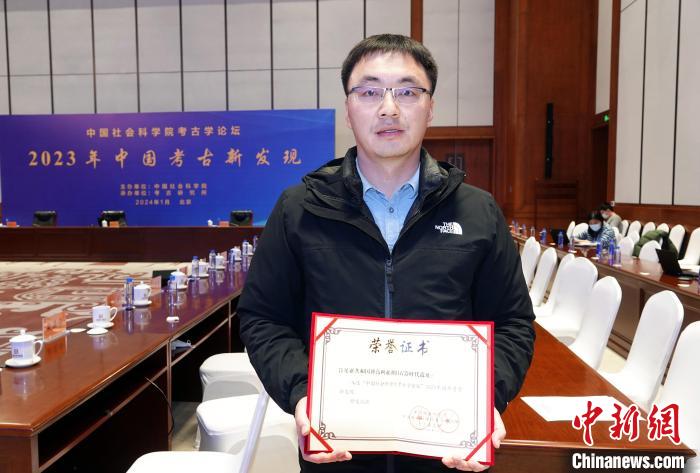 1月30日,2023年中國考古新發現在北京揭曉發布,肯尼亞共和國博高利亞湖舊石器時代遺址入選中國2023年國外考古新發現,趙清坡代表項目領取榮譽證書在會場留影。中新網記者 孫自法 攝