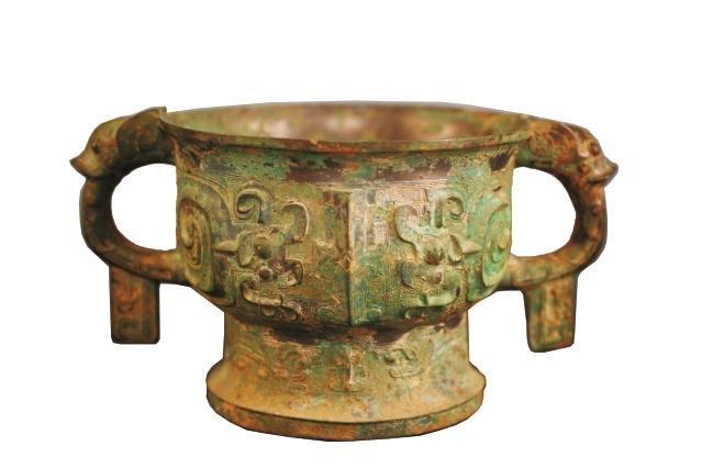 器物保存完整,紋飾十分講究,造型圖案十分精美,為國家一級(jí)文物。通高14.6厘米,口徑19厘米,底徑14.3厘米。鑄造工藝在西周時(shí)期屬于較為上乘之作。夔紋是圖騰紋飾,《說文》中云:“夔如龍而一足。”簋的兩邊為耳,呈環(huán)狀。上部各有一變形的龍首,顯得十分莊重、大氣。整個(gè)器物周身布滿綠銹,脫銹之處露出青銅光澤,透出歷史的厚重之美。