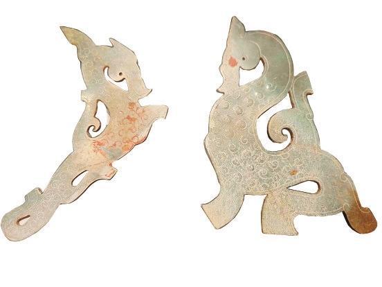 這對(duì)戰(zhàn)國谷紋玉龍,一個(gè)完整,一個(gè)略有殘缺。春秋戰(zhàn)國的龍,龍身很長,蜿蜒曲折,一般成對(duì)出現(xiàn)。龍身的裝飾,以谷紋或勾云紋為主,造型較多見的有蟠龍、行龍、虬龍、夔龍。戰(zhàn)國的龍身形態(tài)各異,基本上有個(gè)共同特點(diǎn)—“水滴眼”,龍頭多為“連云頭”,廓線出鋒,棱角分明。裝飾上多為陰刻和浮雕工藝。