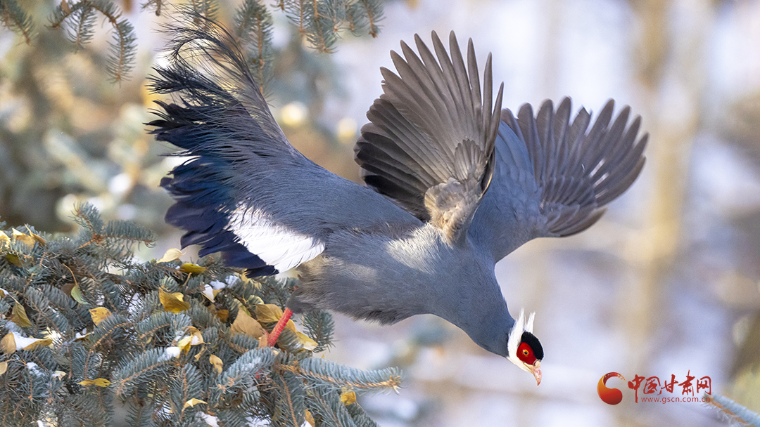 冬日里,藍馬雞成群飛落山腳覓食,藍羽丹頂行走在雪地格外搶眼。覓食時,藍馬雞常用爪刨挖林中空地苔蘚和林緣草地,尋找掉落的云杉種子,刨食的過程會使土壤裸露出來,便于云杉種子生根發芽,促進云杉林天然更新。