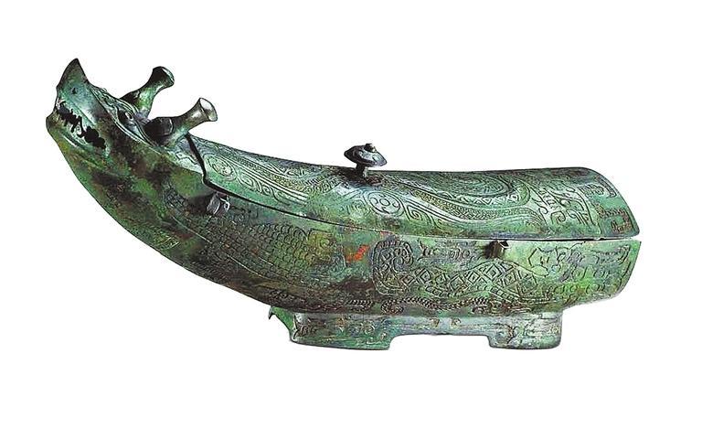 陜西寶雞出土的逨盉,酷似現代的扁圓形壺,器身呈扁圓形,長方形口上有鳳鳥形蓋。鳳鳥引首高昂,喙微卷曲,振翼欲飛。器身與蓋用虎形鏈及雙環相連,虎作向上爬行狀,頭左偏而尾上卷。直管狀流,流端作龍首狀。鋬呈龍首向下噴水狀,下有四獸足。腹部兩側紋飾相同,分別由三圈組成,由外向內依次為變體夔龍紋、重環紋和蟠龍紋。逨盉是祭祀禮器,它將天上飛的鳳鳥、地上跑的猛虎、水里游的蛟龍,作為溝通天地、人神的使者,使天地人三者合而為一。由于周人將動物視為具有無限神力之神靈,因此青銅器上之動物紋樣,除宗教祭祀意涵外,也富有一定的政治意義。貴族通過青銅器上神秘肅穆的動物紋樣,令人望之崇敬生畏,以威嚇被統治者,達到鞏固本身地位及權威之目的,同時也含有龍騰虎躍鳳呈祥的美好寓意。