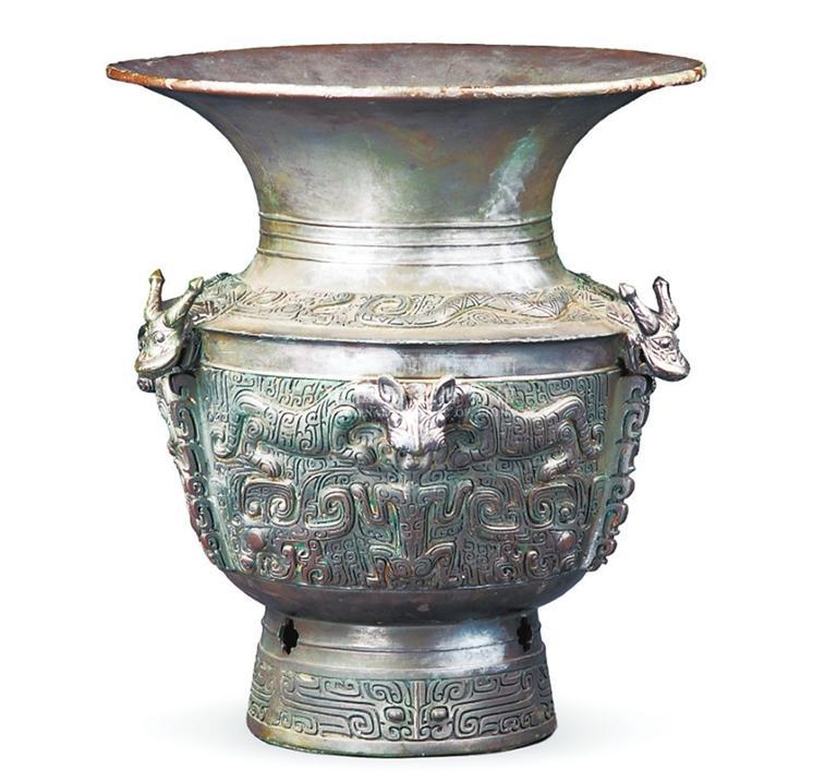 中國國家博物館收藏的龍虎紋青銅尊,高50.5厘米,重26.2千克,為一件體形較高大的盛酒器。青銅尊肩部以圓雕和浮雕相結合,塑造3條生動的蟠龍形象,龍身蜿蜒,龍首探出,額有雙角,闊吻巨口,兩眼大睜。腹部紋飾為一個虎頭兩個虎身,虎口之下有一人形,人頭銜于虎口之中。虎身下方以扉棱為界,飾兩夔龍相對組成的獸面。從主體花紋看,龍、虎、人造型莊嚴穩重、奇特神秘,特別是龍頭和虎頭用澆鑄法從外壁突兀凸起,雄健粗獷,比起用高浮雕法更具有一種威武逼人的悍氣。龍虎尊圓形大口表示上天,肩部神龍游蕩于空中;猛虎張牙舞爪守護大地。龍虎尊的鑄造采用十八塊母范經兩次焊接而成,渾然一體,毫無痕跡。整器工藝精湛,花紋線條洗練,是商代青銅器中的精品。