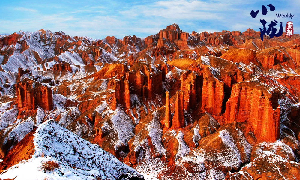 雪后初晴,紅色的山體與潔白的積雪交相輝映,丹霞奇觀在冬雪的映襯下宛如仙境,蔚為壯觀。