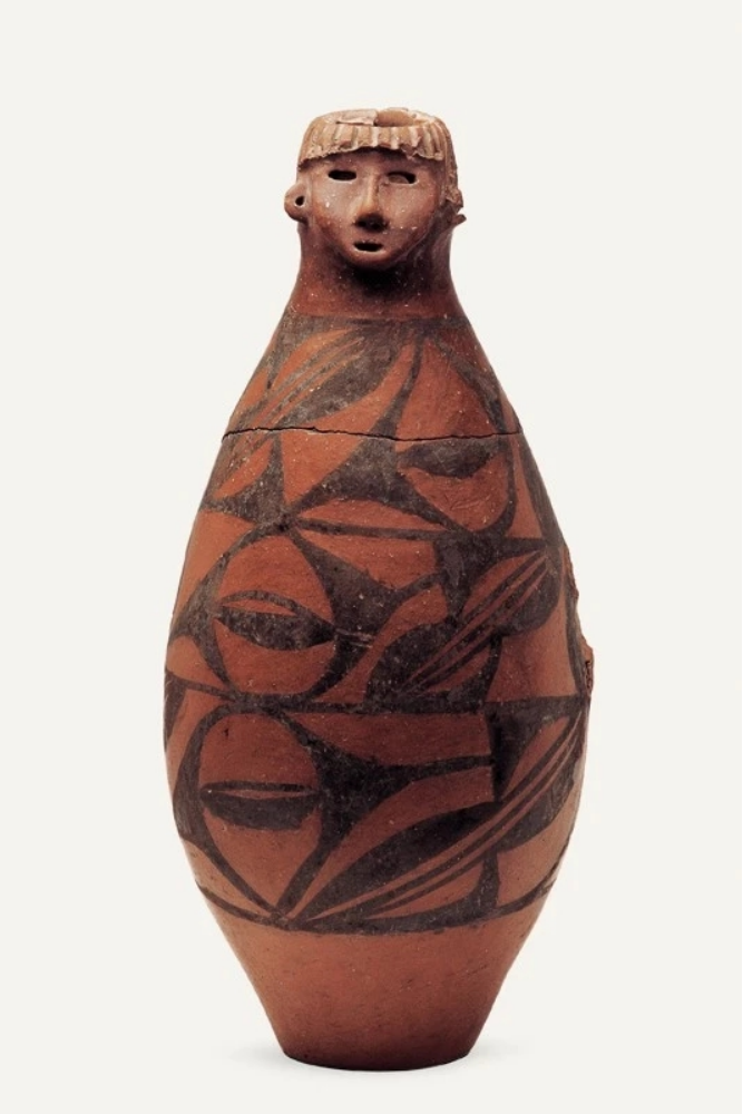 隴東少女作為甘肅的“顯眼包”之一,是曾在《國家寶藏》中出現過的“網紅”、甘肅省博物館鎮館之寶,它于1973年從秦安縣大地灣遺址出土。具有高度審美能力的“托尼”老師,設計了齊劉海發型,顯得很泰酷辣,圓鼓腹、平底,人們細看發現,陶人的兩眼為圓孔洞,顯得目光深邃;鼻子呈蒜頭形,雕有鼻孔;嘴較小,微微張開,好像正在言語;兩耳外展,皆有穿孔;瓶體從上至下以黑彩飾三層大小相同、由弧線三角紋和斜線組成的二方連續圖案,以示華麗的衣物。另外,陶瓶人頭像的器口運用了不同的制作手法,頭發、嘴系雕刻而成,鼻、臉是捏塑而成。人頭像五官整齊、面龐秀麗,器身造型典雅,與人物形象渾然一體,既是大地灣文化彩陶的代表作,也是中國史前集彩繪、雕塑與造型藝術于一身的杰作。估計任誰看一眼,都會被“她”的神秘和美麗所吸引吧。