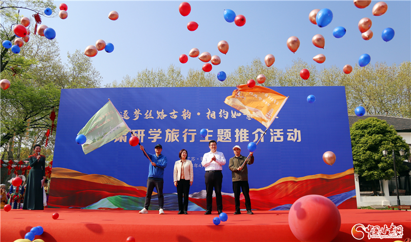 活動中,具有甘肅民族特色的舞蹈串燒和特色民歌快閃吸引了大批當地群眾和游客駐足觀賞。甘肅省文旅廳、鎮江市文旅局分別向即將出發前往甘肅的“詩與遠方”主題研學旅行團隊、“星耀隴原”主題研學旅行團隊授旗。