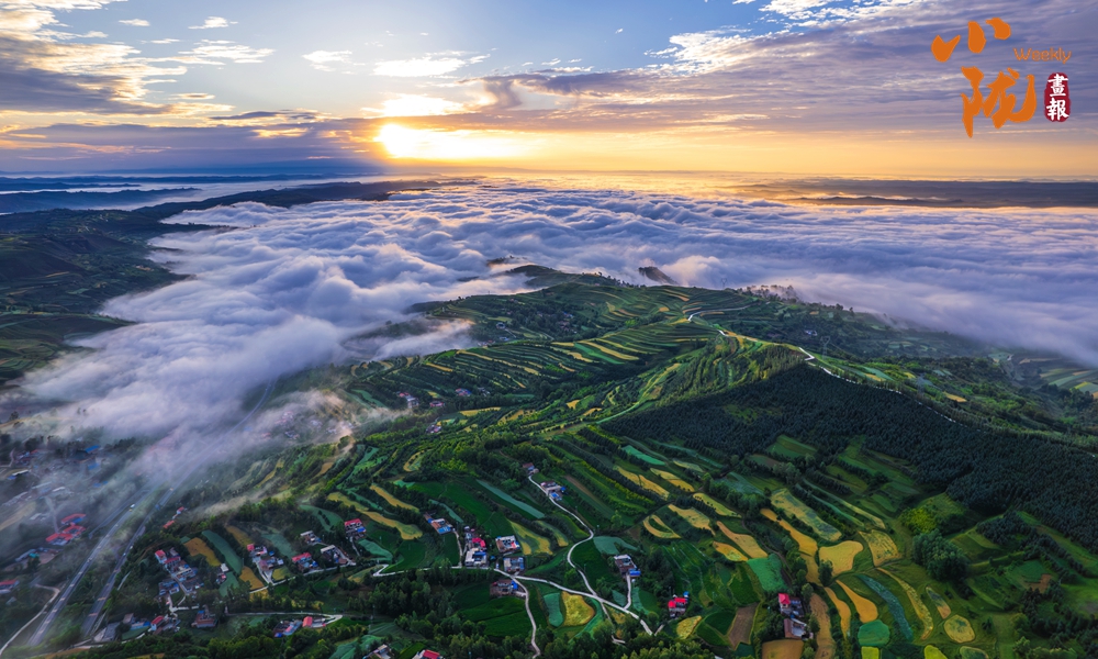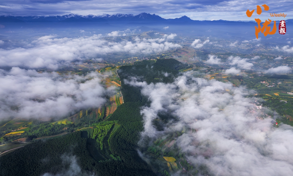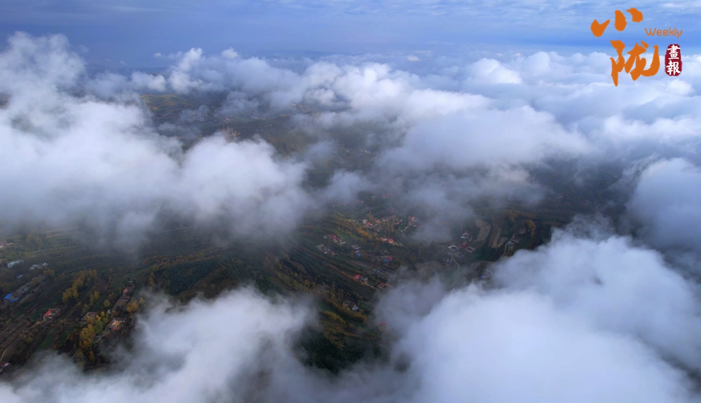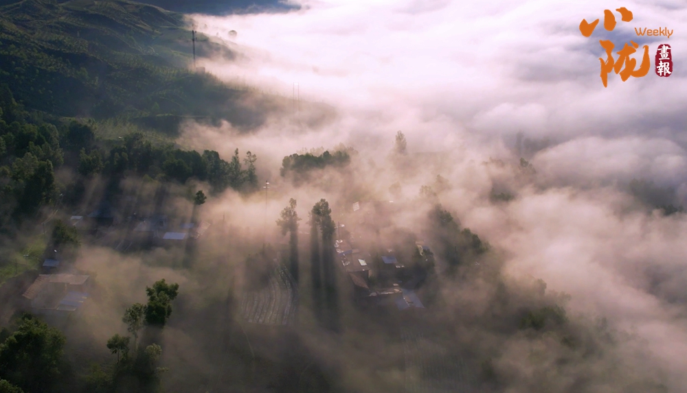 從高處俯瞰,白色的云海在大地上空翻騰涌動,時而聚攏,時而消散,田園、村莊在云霧中時隱時現,如夢如幻。