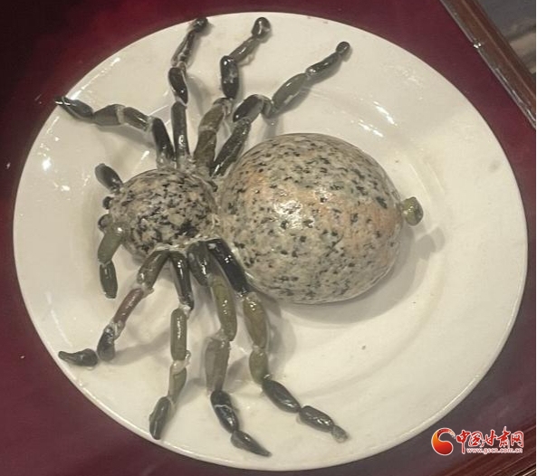 兩個(gè)花紋沒啥特點(diǎn)、一大一小的圓形石頭,再加上更細(xì)小的石粒,竟然被創(chuàng)作者粘連起來(lái),打造成了一只“蜘蛛”,惟妙惟肖。