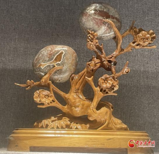 還有兩塊看似普通的小石頭,用樹根雕成的花架支撐起來(lái),上方的石頭似圓月當(dāng)空,下面的一塊花紋石,花紋類似一只鳥,這件作品起名“枝頭戀歌”,不得不佩服創(chuàng)作者的浪漫情懷。