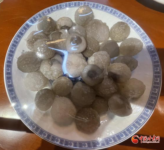 最令我過(guò)目難忘的是“中華百家宴”,我曾經(jīng)在其他地方的玉器展上看到過(guò)“滿漢全席”,而玉器大多經(jīng)打磨雕琢,太過(guò)匠心。臨洮洮河石文化博物館的這桌“中華百家宴”,則基本是石頭原貌,在大自然的雕琢下呈現(xiàn)出獨(dú)特的形態(tài),更顯奇特曼妙。一碟碟的“珍饈佳肴”上覆保鮮膜,有剛剝了殼的軟嫩荔枝,有點(diǎn)綴著紅辣椒綠蔥花的連皮燉肉塊,有表面起酥的炸肉串......看在眼里就覺鮮香可口,令人垂涎欲滴。若不是隔離繩攔著,若不是每個(gè)碗碟上都有保鮮膜蓋著,看到忘乎所以,若是拿起筷子夾一塊大快朵頤,滿嘴牙怕要分崩離析。