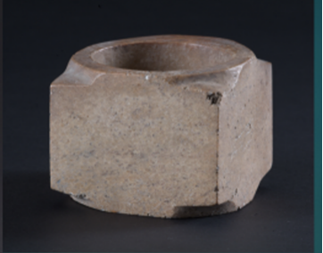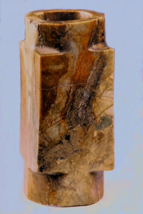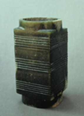 玉琮(編號總0128:1)高4~4.2厘米,外方邊長6.1~6.3厘米,內徑5.2厘米,上端射較長,下端射極短,形制原始古樸,切割改制的現象明顯。