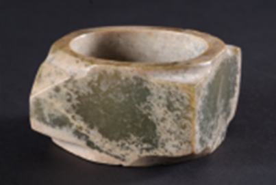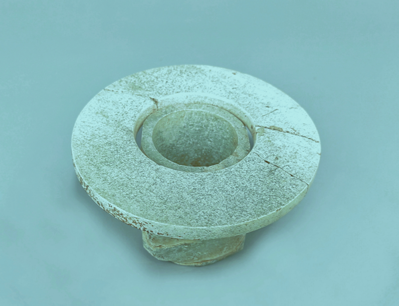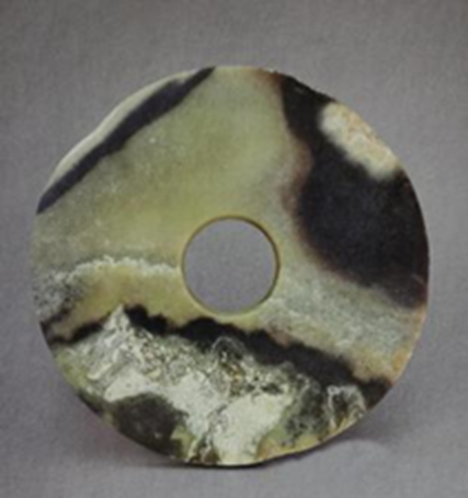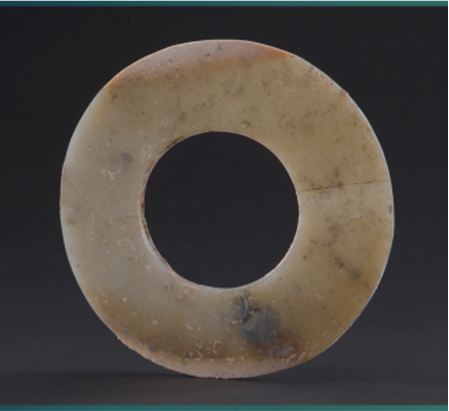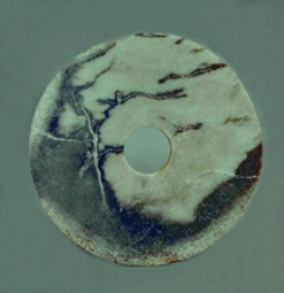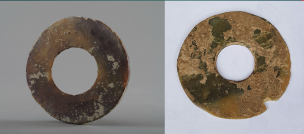 玉璧(編號總0129:5)直經9厘米,單面鉆孔,大端孔徑4.4厘米,小端孔徑4厘米,厚度0.55—0.7厘米,璧外緣有磕碰痕。