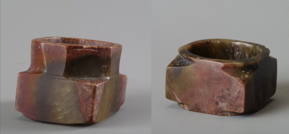 根據以上兩件玉琮形狀和材質顏色比對,它們原為一件較大的玉琮被切割成兩件。