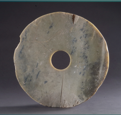 玉琮(編號IB1049),屬三件玉琮中形體最小的,外表呈夾有青黑斑點的灰白色,形制屬扁矮方型,其中外方一角下削,與前兩者相同。高僅2.7厘米,孔經3.8厘米,外徑4.8厘米。玉璧(編號IB1066),直經25.4厘米,璧呈豆綠色夾有大量所謂海藻紋,璧面傾斜最甚,最厚處0.8厘米,最薄處僅0.2厘米,邊緣制作亦欠規整。