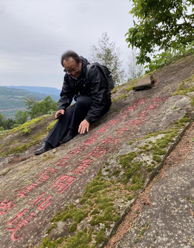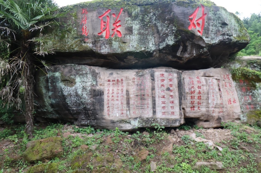 山上隨處是石,或臥或立,俱有雄獅虎豹之勢;或平或峻,皆作岡陵之態。青峰續脈,絕頂鷹飛。鑿巖壁以造法像,栩栩如臨宮闕;摩巨石而鐫嘉聯,文華直射牛斗。石多瑰偉,苔覆璞瑜,油菜花點綴其間,引來蜜蜂蝴蝶共舞。山茶與毛竹同畦,郁郁蔥蔥;峰巒與云煙共養,莽莽蒼蒼。遇目石上鐫字,瀏賞翰墨煙霞;振藻揚毫,皆寰中俊杰;椽筆斯文,多隴蜀賢達。或赤子肝膽,燭照于史;或凜然浩氣,嘯傲大千。聯壁生輝,文曲星彰;峣巖開竅,氣通神明。文采煥然與星河同輝,詩儕競秀潤厚山玉顏。壯懷詩夢,漱玉溪流。在一塊巨石斜面上,有同伴發現刻有筆者所書長聯,興奮得喊叫起來。這是三年前應曹興章先生之約而作,聯曰:翰墨生輝,千秋勝景開仙境;源泉流韻,萬象韶光耀厚山。我用手指扣去筆畫生出的茂密青苔,坐下來與我的聯合影留念。信是蓮花開石上,遙遙至此結仙緣。