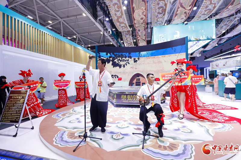 作為“一見慶陽”主題文化日活動的一部分,慶陽剪紙秀+南梁說唱同臺展示,大氣、時尚,盡顯魅力的設(shè)計和展示,淳厚、粗獷,極具特色的吹奏和演唱,現(xiàn)場參觀者或駐足觀賞、或拍照,整個場館淹沒在濃濃的慶陽民俗風味里。