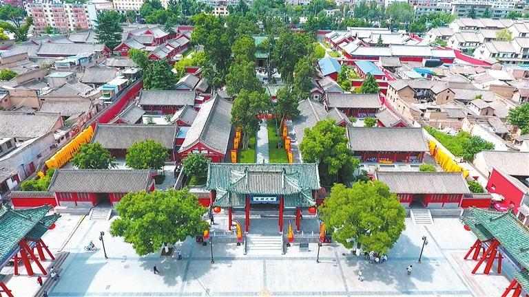 伏羲廟,位于天水市秦州區,又名“太昊宮”,俗稱“人宗廟”,是一座專門祭祀中華人文始祖太昊伏羲氏的明代宗廟建筑群。現存建筑建于明成化十九年(公元1483年),是目前我國保存最為完整、建筑年代最早的祭祀伏羲氏的廟宇,其建筑群呈宮殿式建筑模式,整個建筑群坐北朝南,牌坊、宮門、儀門、先天殿、太極殿沿縱軸線依次排列,層層推進,莊嚴雄偉,并有碑廊、鐘鼓樓等多處建筑,為全國重點文物保護單位。因其周圍皆是明清和民國時期的民居建筑群落,便有了慕壽祺聯中的“萬山都近圣人居”之說。