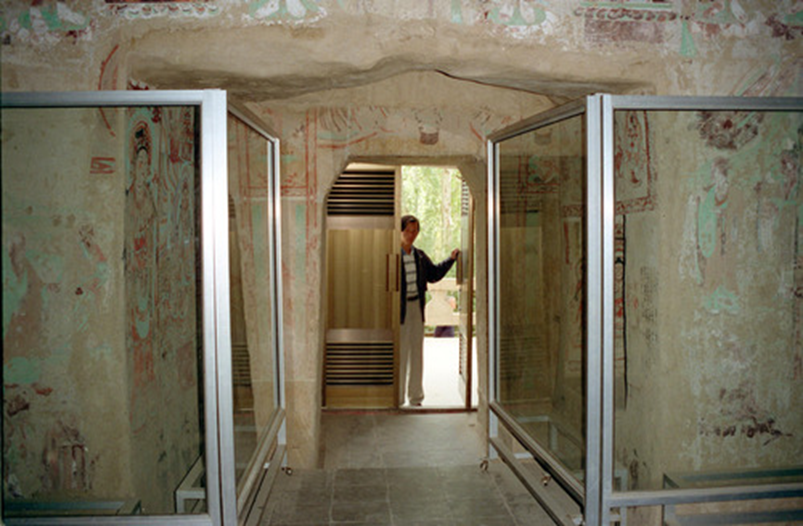 圖為莫高窟的367個洞窟安裝了鋁合金窟門,并在94個開放的洞窟安裝了玻璃屏風,即保護了壁畫的彩塑,又不影響參觀者視線。新華社記者彭張青攝(1996年11月24日發)