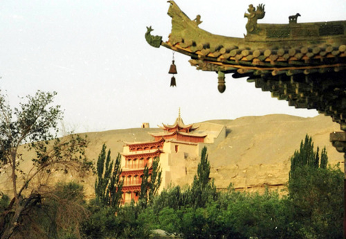 從20世紀70年代末開始,大量先進科技不斷被引入敦煌石窟保護。新技術、新材料、新手段的不斷運用,豐富了敦煌遺產的保護技術和保護手段,有效改變了石窟內部及其環境的保護狀況,使敦煌遺產的保護工作從原來的搶救性保護,過渡到了科學保護階段。圖為透過敦煌莫高窟前的牌樓一角望去,敦煌莫高窟標志性建筑九層樓依舊雄偉壯觀。新華社記者梁強攝(2004年10月25日發)