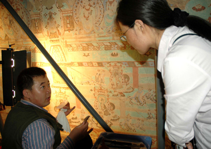 為了讓游客了解世界文化遺產敦煌莫高窟的壁畫保存現狀、保護原則、保護方式,提高公眾對莫高窟文物的保護意識,2008年6月以來,敦煌莫高窟壁畫保護修復現場每周定期向游客開放。圖為2008年9月22日,在莫高窟98窟內,敦煌研究院保護人員(左)正在向一名游客講解如何修復壁畫。新華社記者王艷明攝