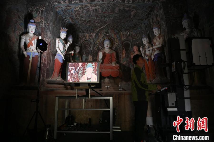2024年6月,甘肅敦煌莫高窟內,敦煌研究院文物數字化研究所工作人員進行敦煌壁畫數字化采集工作。李亞龍 攝
