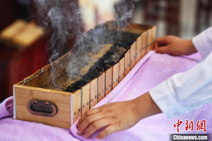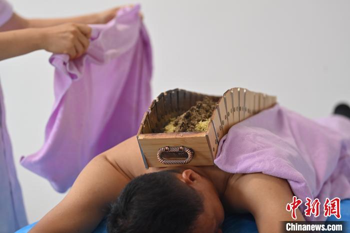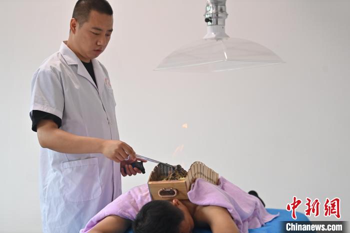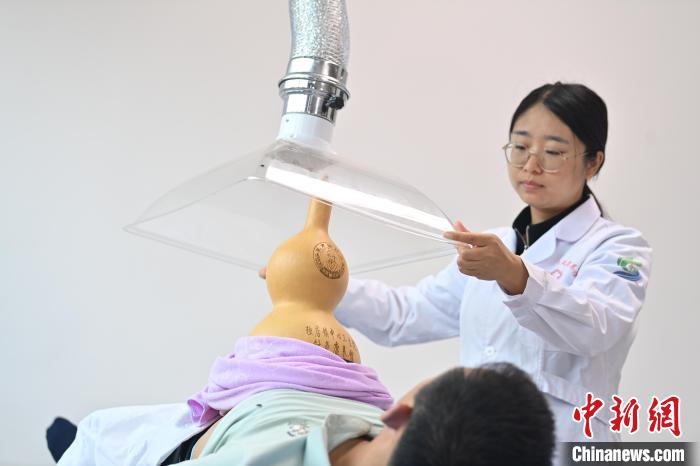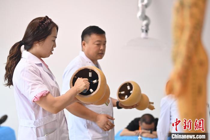 7月16日,甘肅省平涼市靈臺縣皇甫謐針灸康養館內,工作人員對患者進行葫蘆灸治療。2006年,靈臺皇甫謐針灸術入選第一批甘肅省非物質文化遺產名錄。靈臺作為皇甫謐故里,當地民眾非常認可中醫康養,針灸、拔火罐、推拿、葫蘆灸、火龍灸(督脈灸)等中醫特色療法受到了很多人的青睞,當地官方也通過舉辦大型節會等助推中醫康養產業發展。 皇甫謐是針灸醫學鼻祖,其《針灸甲乙經》已在多個國家被廣泛傳播應用。中新社記者 李亞龍 攝