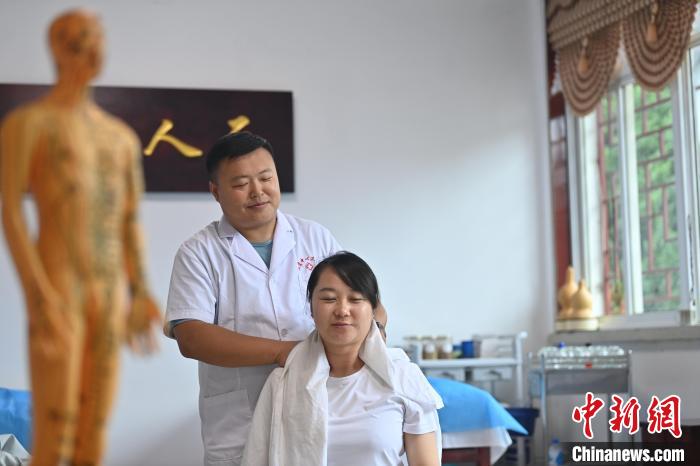 7月16日,甘肅省平涼市靈臺縣皇甫謐針灸康養館內,工作人員對患者進行推拿治療。2006年,靈臺皇甫謐針灸術入選第一批甘肅省非物質文化遺產名錄。靈臺作為皇甫謐故里,當地民眾非常認可中醫康養,針灸、拔火罐、推拿、葫蘆灸、火龍灸(督脈灸)等中醫特色療法受到了很多人的青睞,當地官方也通過舉辦大型節會等助推中醫康養產業發展。 皇甫謐是針灸醫學鼻祖,其《針灸甲乙經》已在多個國家被廣泛傳播應用。 中新社記者 李亞龍 攝
