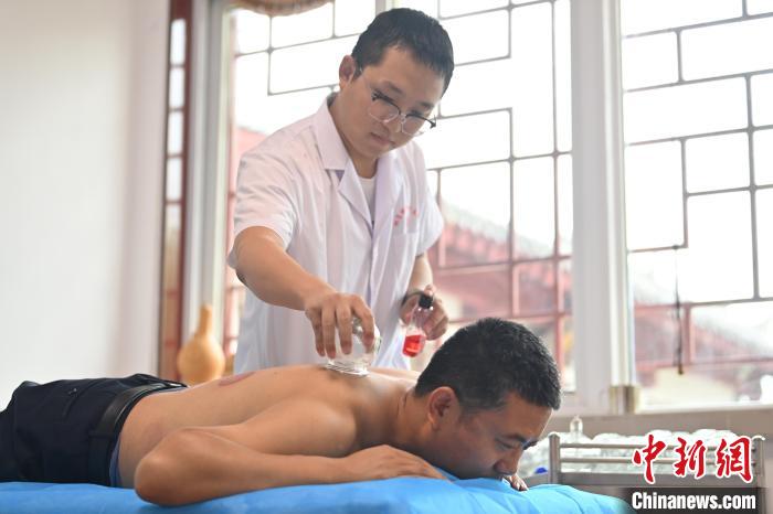 7月16日,甘肅省平涼市靈臺縣皇甫謐針灸康養館內,工作人員對患者進行拔火罐。2006年,靈臺皇甫謐針灸術入選第一批甘肅省非物質文化遺產名錄。靈臺作為皇甫謐故里,當地民眾非常認可中醫康養,針灸、拔火罐、推拿、葫蘆灸、火龍灸(督脈灸)等中醫特色療法受到了很多人的青睞,當地官方也通過舉辦大型節會等助推中醫康養產業發展。 皇甫謐是針灸醫學鼻祖,其《針灸甲乙經》已在多個國家被廣泛傳播應用。 中新社記者 李亞龍 攝