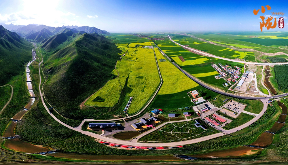 廣袤無邊的田野生機盎然,金黃色的油菜花夾雜著一塊塊碧綠色的麥田,好像給大地鋪上了一層五顏六色的大地毯。漂亮的民居鑲嵌其中,與祁連山相互輝映,在陽光下美麗極了!