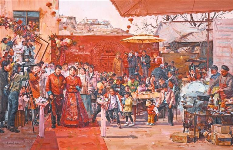 《成紀二月喜盈門》描繪了秦安一對新人舉辦婚禮的場景。身著傳統服飾的新人,在親朋好友祝福中朝觀眾走來。靜心觀察,會發現每個人都充滿鮮明的角色感,樸拙的外表、內蘊的情感、濃厚的民俗、歡樂的場景,共同交織成一方地域上的斑斕畫卷。